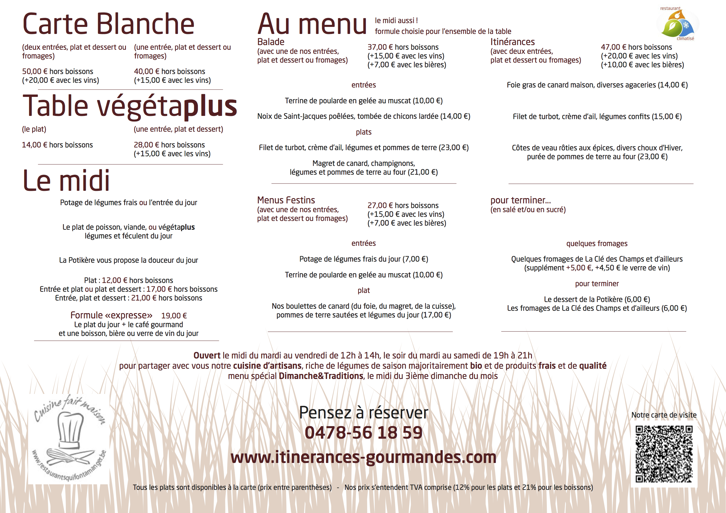 Changements dans la continuité en ce début d’année, suite aux commentaires et aux expériences des 19 derniers mois, nous adaptons légèrement nos formules Itinérances et Balade. Nous créons un repas plus simple « Menus Festins ». Une carte qui devrait changer plus souvent et qui sera aussi complétée par des suggestions.