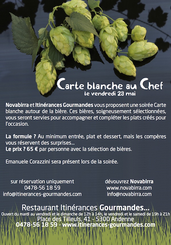 Et puis encore une soirée Carte Blanche en collaboration avec Novabirra (www.novabirra.com) le vendredi 29 mai. Dans le prolongement d’avril 2014, Emanuele revient pour d’autres découvertes et associations. Une belle soirée à déguster !